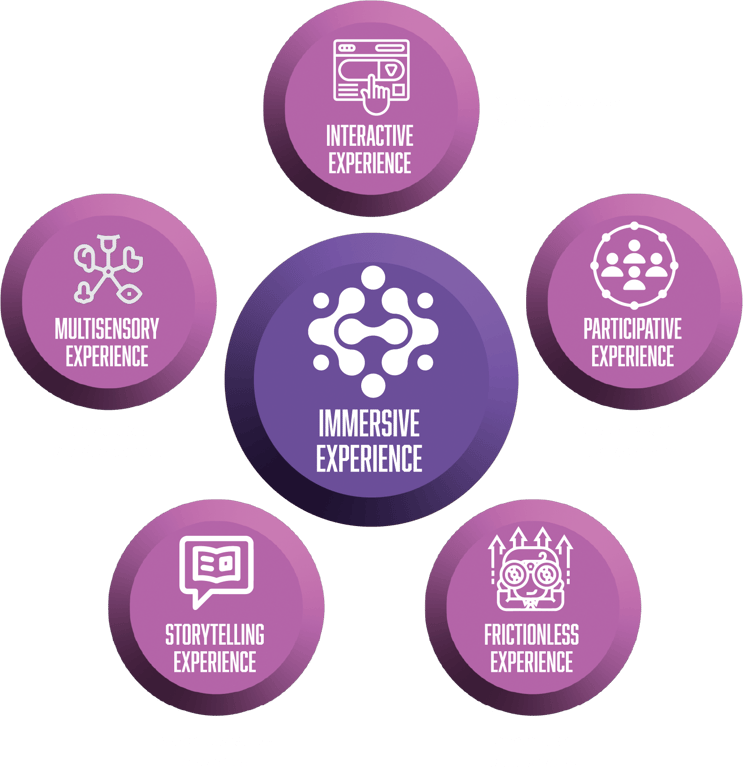 Lima elemen penyusun pengalaman imersif: Frictionless Experience, Multisensory Experience, Participate Experience, Interactive Experience, dan Storytelling Experience.